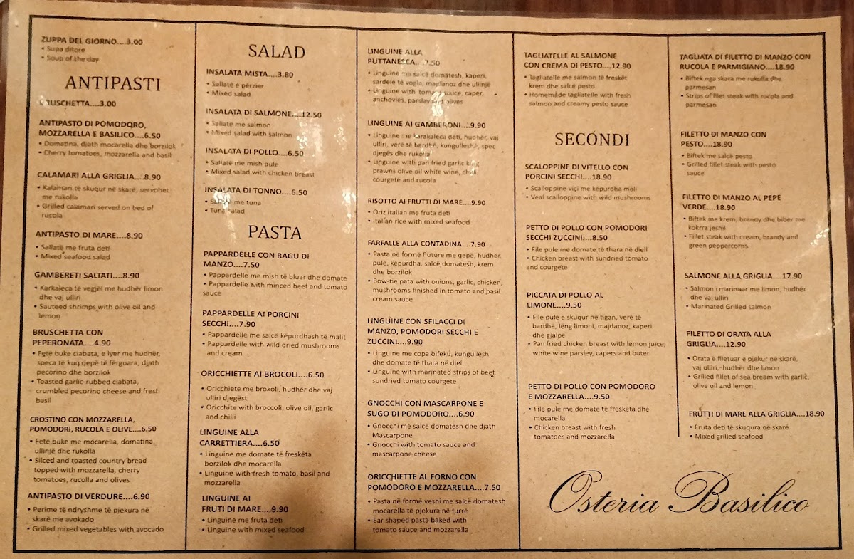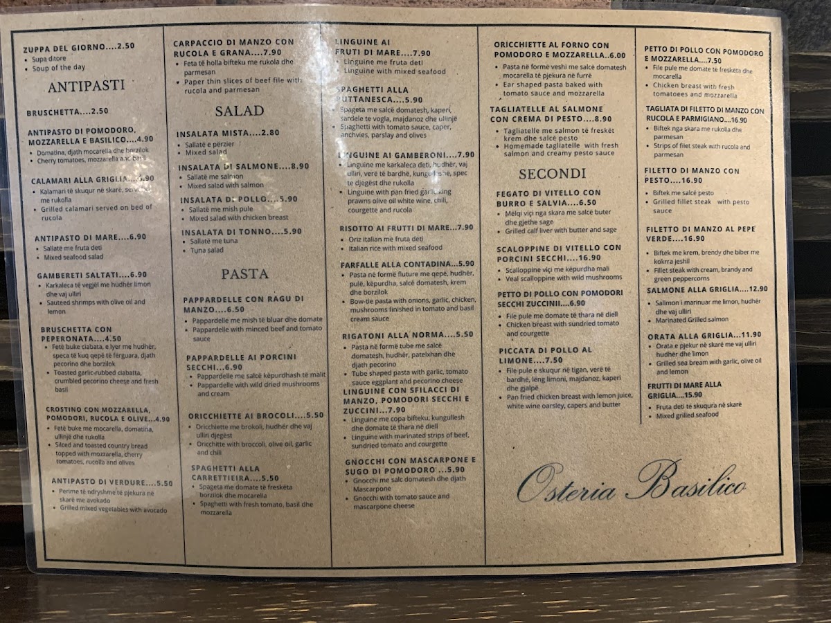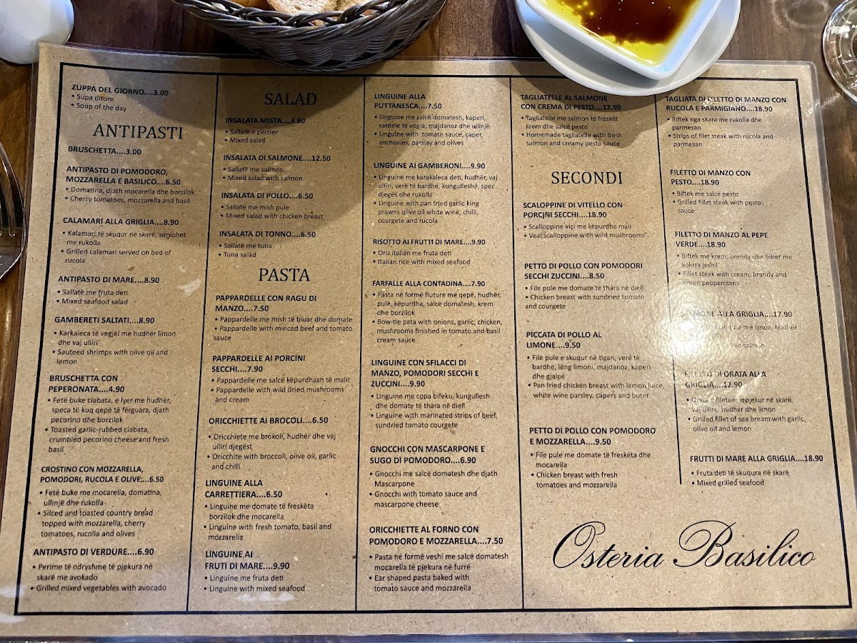 The menu at Basilico Pristina reflects a confident focus on Italian comfort dishes, balancing simplicity with depth of flavor across starters, mains, desserts, and drinks. The experience often begins with Olive Oil and Balsamic with Bread, a straightforward but well-executed opener that sets a rustic Mediterranean tone, alongside light bites like Bruschetta Con, which adds freshness and texture. Seafood lovers are well served with Antipasto Frutti Di Mare, a mixed platter that introduces the kitchen’s handling of fish and shellfish before moving into heartier courses. Pasta is clearly the backbone of the menu, with classics such as Bolognese delivering familiar richness, while vegetarian-friendly options like Vegetable and Pasta with Wild Mushrooms and Cream Cheese highlight earthy flavors and creamy balance. Mushroom enthusiasts will appreciate the depth found in Paccheri Ai Funghi Porcini and Ex-pappardelle Ai Porcini, both emphasizing the aroma and intensity of porcini. For those who prefer bolder, more assertive profiles, Linguine Alla Putanesca offers a savory, briny punch, while Linguine Ai Frutti Di Mare brings together pasta and seafood in a cohesive, satisfying way. The grill section adds variety with Filet for meat lovers and Orata Alla Griglia, a clean, well-balanced fish dish that pairs naturally with sides like Puré Di Patate E Spinaci, which rounds out the plate with smooth texture and mild greens. To finish, Tiramisu provides a classic Italian dessert note, light yet indulgent, and beverages such as Cappuccino and Birra Locale complete the meal comfortably, reinforcing the restaurant’s aim to deliver a complete, well-structured Italian dining experience through its menu.